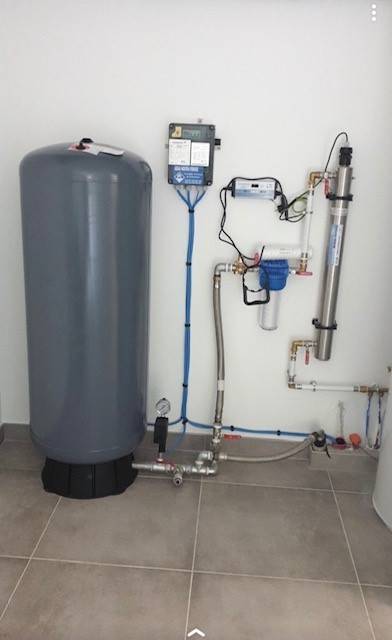 Station de pompage chez un particulier, ci dessous la jonction entre la pompe et le surpresseur. (le surpresseur donnant ordre à la pompe de s'enclencher lorsque celui se vide.)